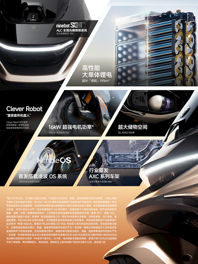 M5系列电摩继承“Clever Robot”盘算推算说话,匹配 ALC 全境光幕照明系统,搭载AXC系列车架,配有加长斜踏和超宽平踏,粉饰165cm至185cm身高,车辆内置32L大座桶空间。