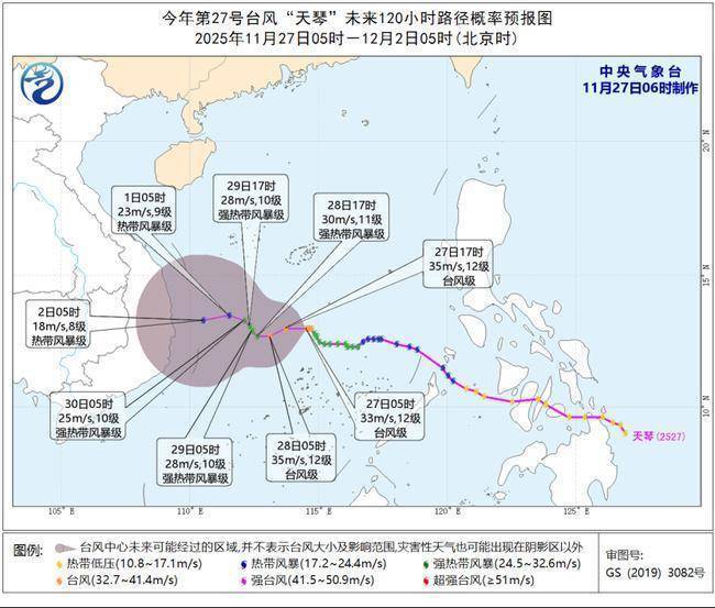 大风预告:27日08时至28日08时,受台风和冷空气的共同影响,台湾海峡、巴士海峡、台湾以东瀛面、南海大部及东沙群岛、西沙群岛、中沙群岛、南沙群岛、黄岩岛隔邻海域、北部湾、台湾沿海、福建沿海、广东沿海、海南东部沿海将有6-8级大风,其中南海中部和南部部分海域风力可达9-10级,“天琴”中心过程的隔邻海域风力可达11-12级,阵风13-14级。