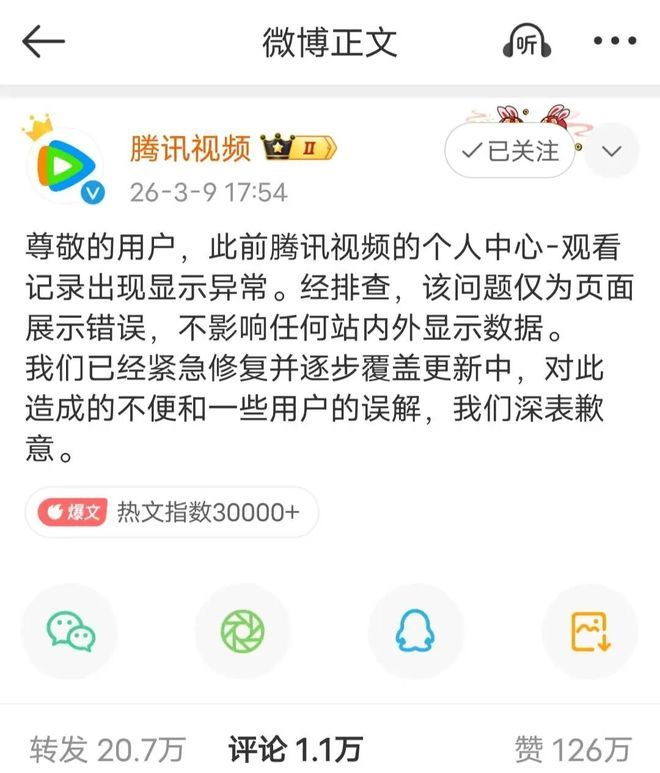 “尊敬的用户,此前腾讯视频的个东说念主中心-不雅看记录出现高慢相当。经排查,该问题仅为页面展示诞妄,不影响任何站表里高慢数据。”腾讯视频称,已伏击建筑并迟缓隐秘更新,“对此形成的未便和一些用户的污蔑,咱们深表歉意 ”。