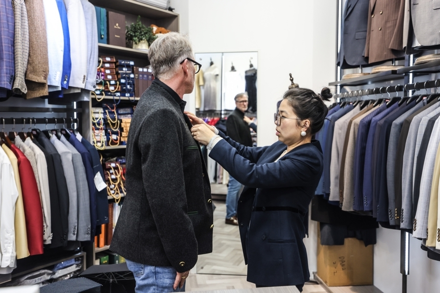 3月的一天,一对德国佳耦来陈丹店里。这对佳耦旧年12月第一次来上海,经一又友先容来店里作念了五六件衣服,几个月后他们再次来访。陈丹陪着他们挑选面料、征询名堂、商谈价钱,前后勤劳了两个小时。宾客离开时,她一齐送外出外,回身回归运转整理刚翻乱的样衣。